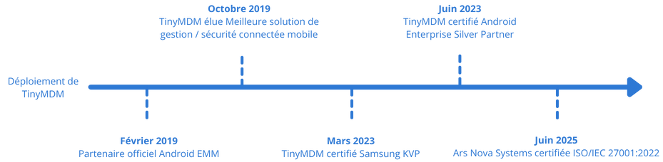 En juin 2025, TinyMDM, via Ars Nova Systems, a obtenu la certification ISO/IEC 27001:2022. Cette certification est une norme internationale qui spécifie les exigences relatives au système de gestion de la sécurité de l’information (SGSI). Elle permet d’évaluer, de gérer et de réduire les risques liés à la sécurité des informations sensibles, qu’il s’agisse de données personnelles, financières ou d’autres types d’informations critiques. Cette norme impose aux entreprises de mettre en place un ensemble de contrôles rigoureux afin de protéger ces données contre les risques de divulgation, de modification ou de perte.