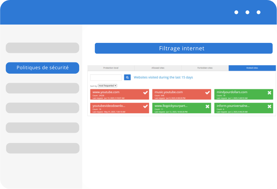 Le filtrage Internet offre des capacités de surveillance en temps réel, permettant d’avoir un aperçu des activités de navigation. Cette fonction permet aux administrateurs d’identifier tout risque potentiel pour la sécurité, de suivre les violations de la politique et de prendre des mesures rapides si nécessaire.