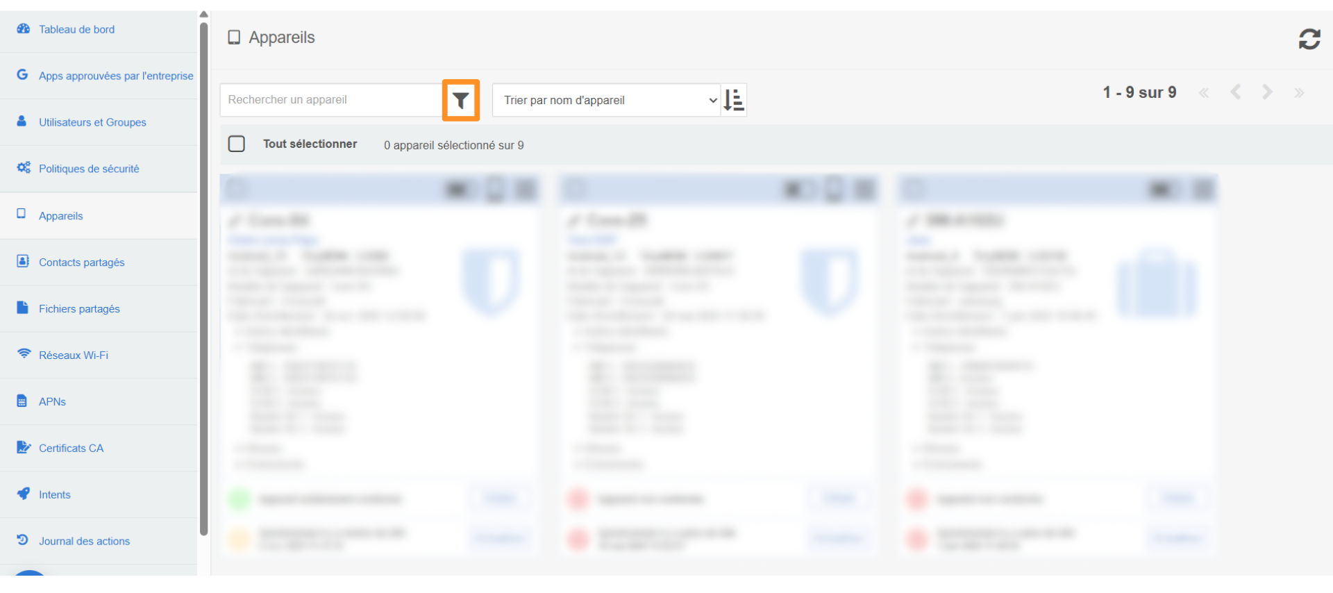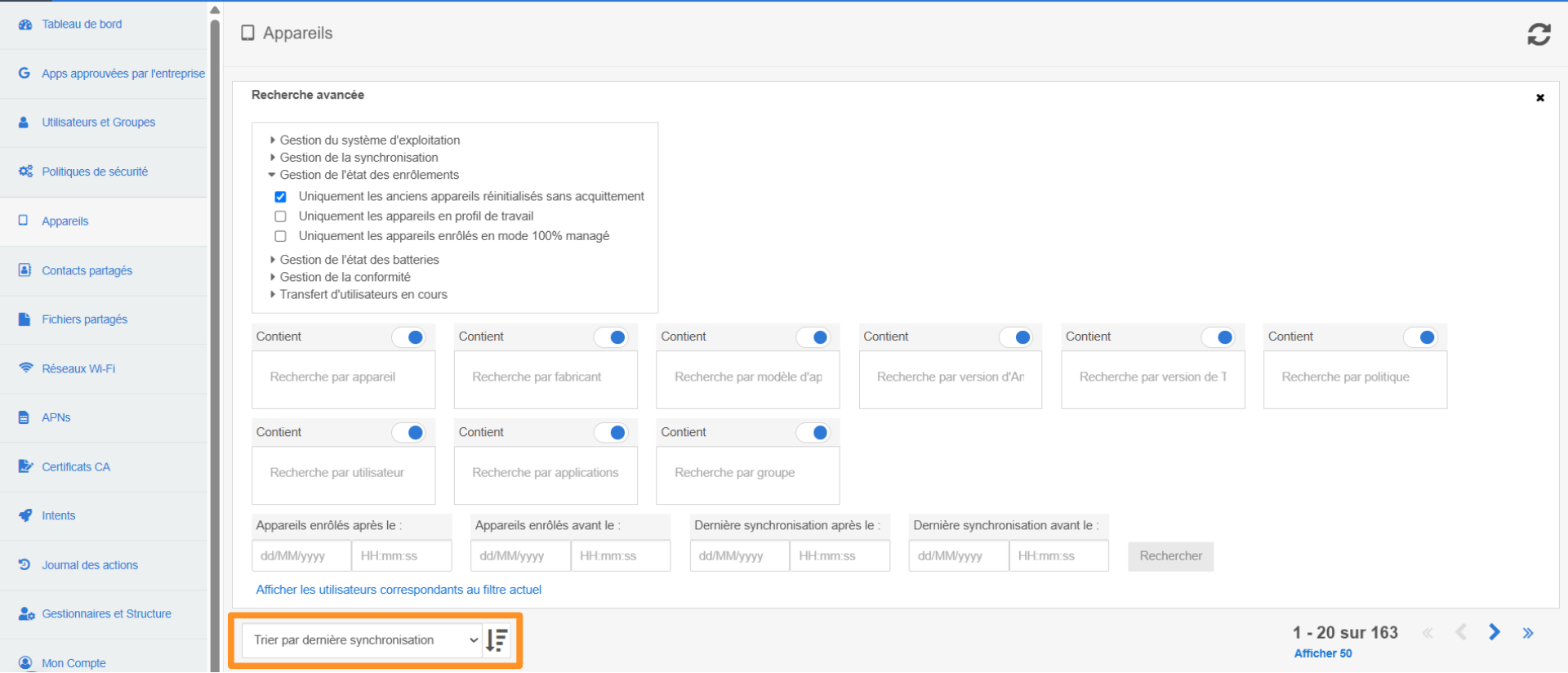 3. Vous pourrez ensuite retrouver chacun de vos appareils en les triant par nom d’appareil, date de création ou date de dernière synchronisation: