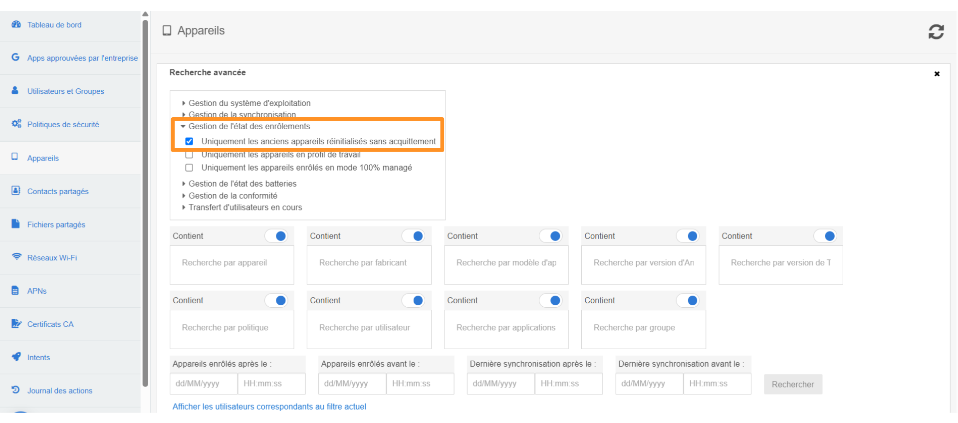 2. Puis sous Gestion de l’état des enrôlements, de sélectionner Uniquement les anciens appareils réinitialisés sans acquittement: