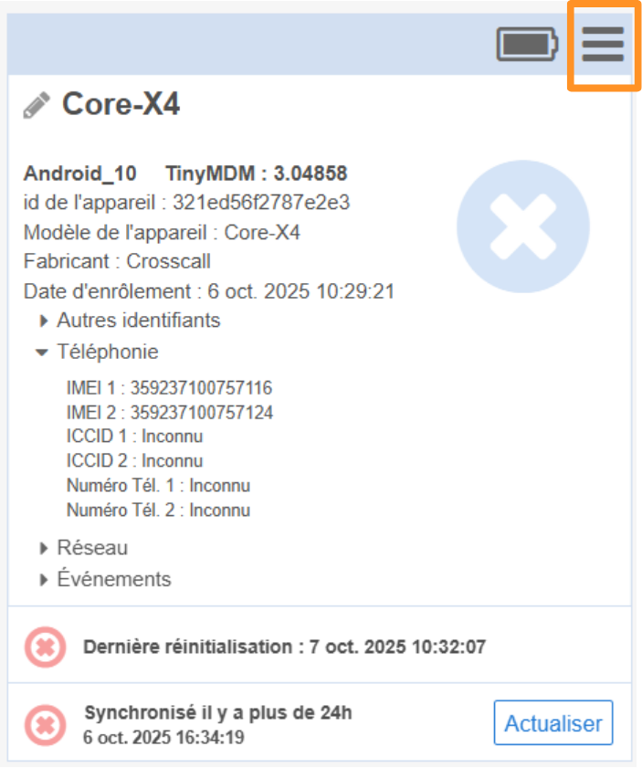Si vous effectuez une nouvelle demande de réinitialisation et qu’elle est bien réceptionnée par l’appareil, alors sa carte disparaîtra complètement de la console d’administration TinyMDM.