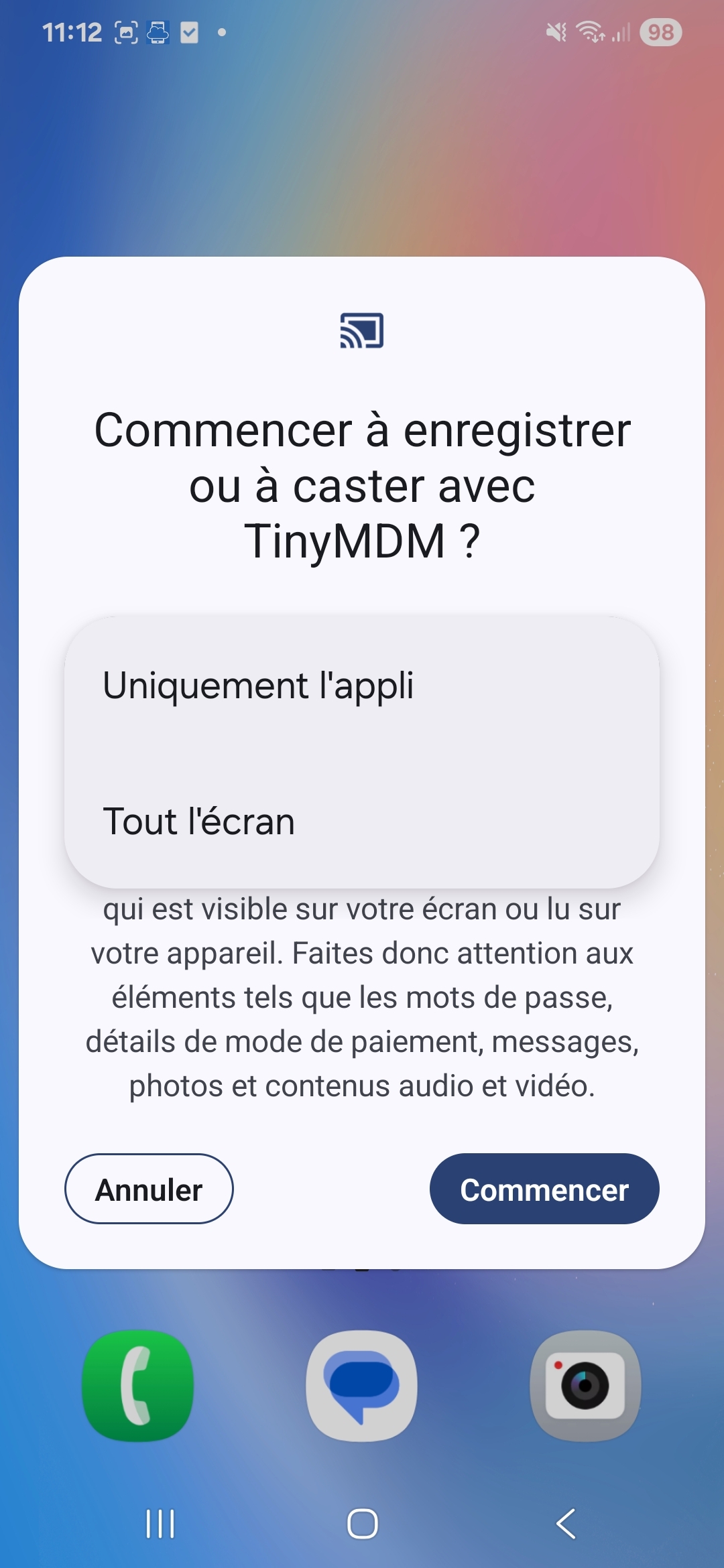3. Sur certains appareils, une seconde fenêtre Démarrer l’enregistrement ou la diffusion avec TinyMDM ? peut également apparaître. Cette seconde fenêtre ne peut pas être masquée depuis la politique de sécurité. Il faut cliquer sur Commencer depuis l’appareil pour que la session puisse démarrer:
