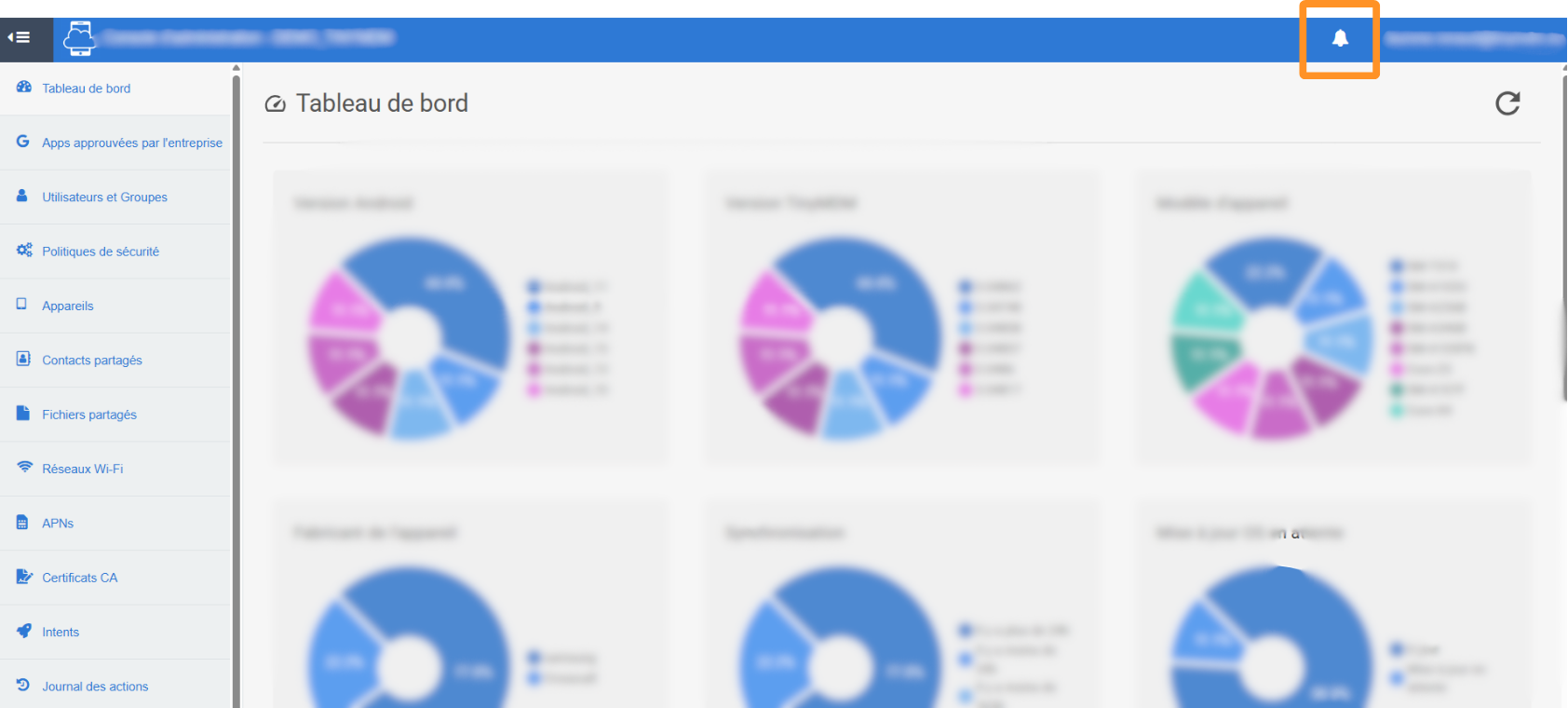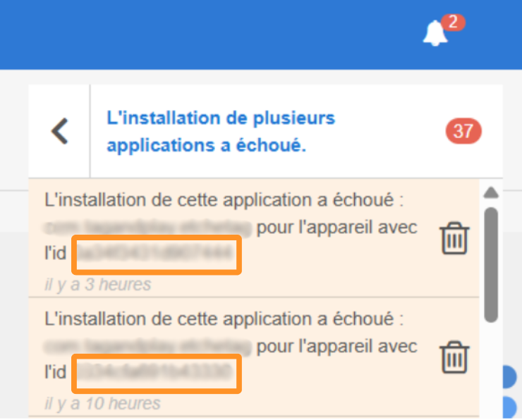 Si une erreur se produit lors de l’installation ou de la mise à jour d’une application TinyMDM Store, une notification sera affichée dans votre console. Pour retrouver l’appareil concerné par l’erreur et comprendre ce qui la déclenche, il vous suffit d’ouvrir la cloche de notifications, en haut à droite de votre console d’administration:
