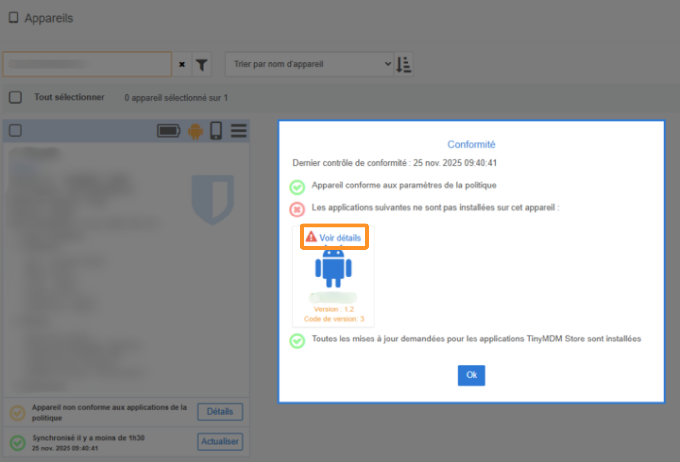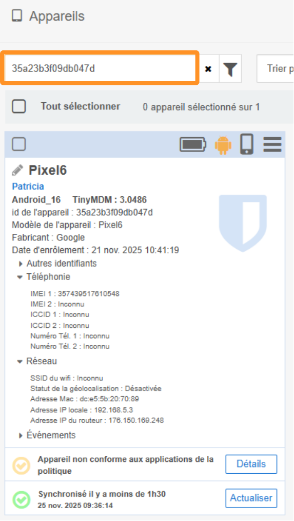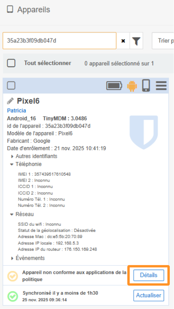 D’ouvrir l’onglet Appareils et de coller l’identifiant dans la recherche simple afin de voir apparaître l’appareil concerné. Puis dans la fenêtre qui s’ouvre, cliquez sur Voir détails:
