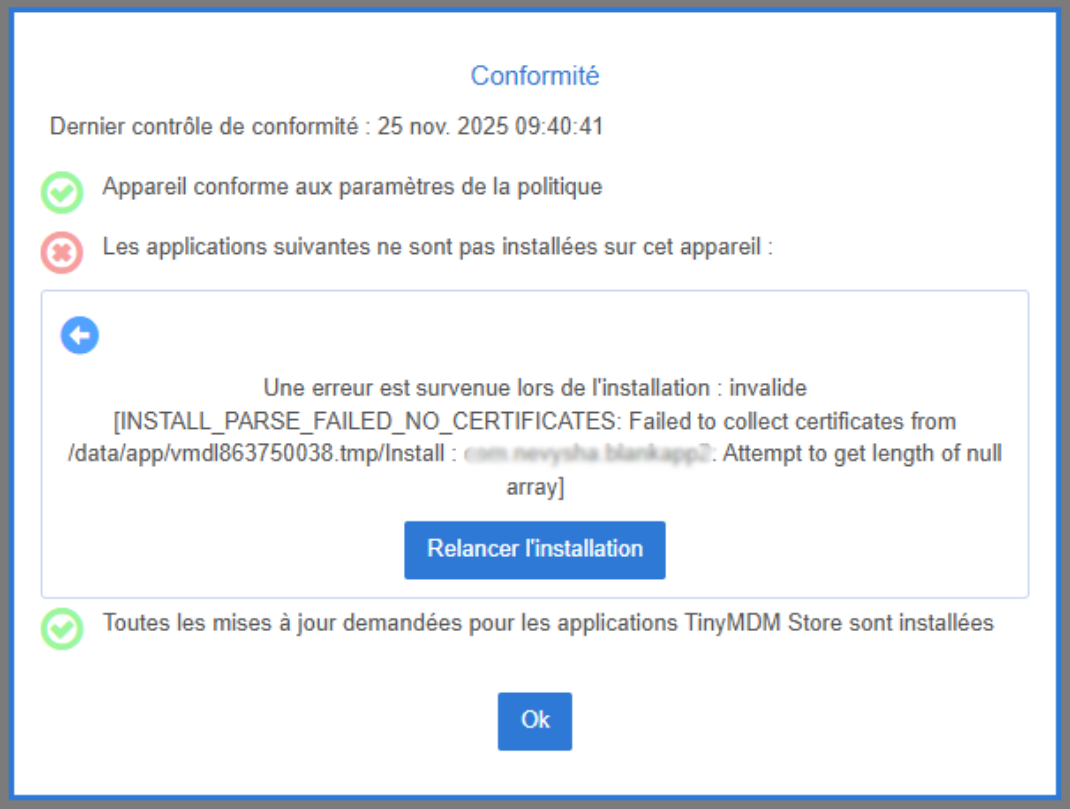 L’erreur ci-dessous est une erreur qui vient du système Android de l’appareil, pas de TinyMDM. Si elle n’est pas explicite, n’hésitez pas à faire une recherche web pour en connaitre le sens: