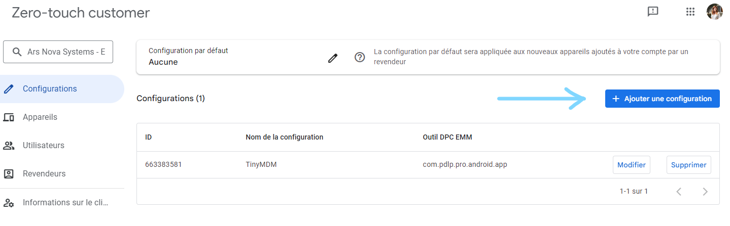 Dans l’onglet Configurations, cliquez sur Ajouter une configuration pour créer une configuration propre à TinyMDM.